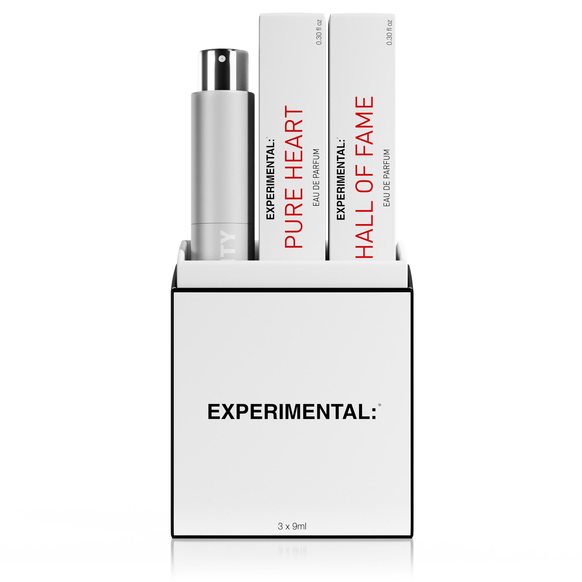 Ένα κουτί παρουσίασης που περιέχει τρία εμβληματικά αρώματα: PURE HEART, HALL OF FAME και FIRST TIME, σε φιαλίδια των 9ml, σχεδιασμένα για χρήση με τη λειτουργική και διαχρονική θήκη ταξιδιού της MiN NEW YORK – ελαφριά και με το χαρακτηριστικό της λογότυπο.